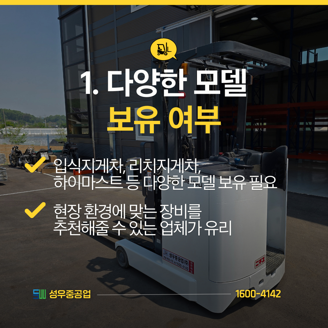 입식지게차, 리치지게차, 하이마스트 등 다양한 모델을 갖추고 있어야 하며,