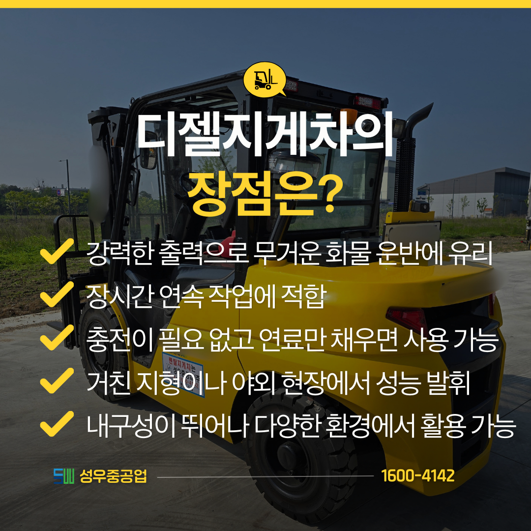- 야외 작업 및 무거운 화물 운반에는 디젤 지게차를 권장합니다.