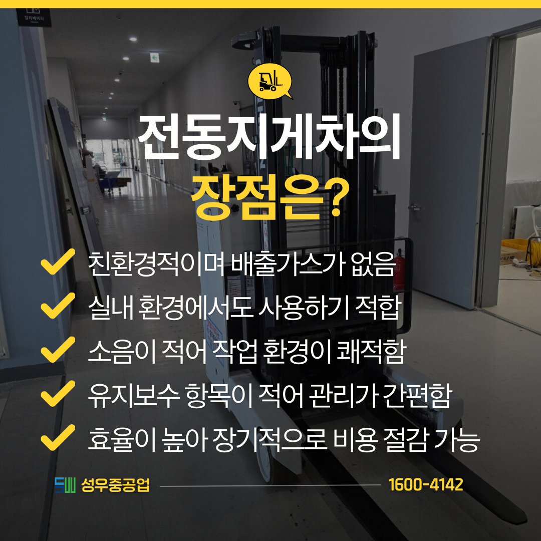 - 실내 작업 및 물류창고 환경에는 전동 지게차를 추천합니다.